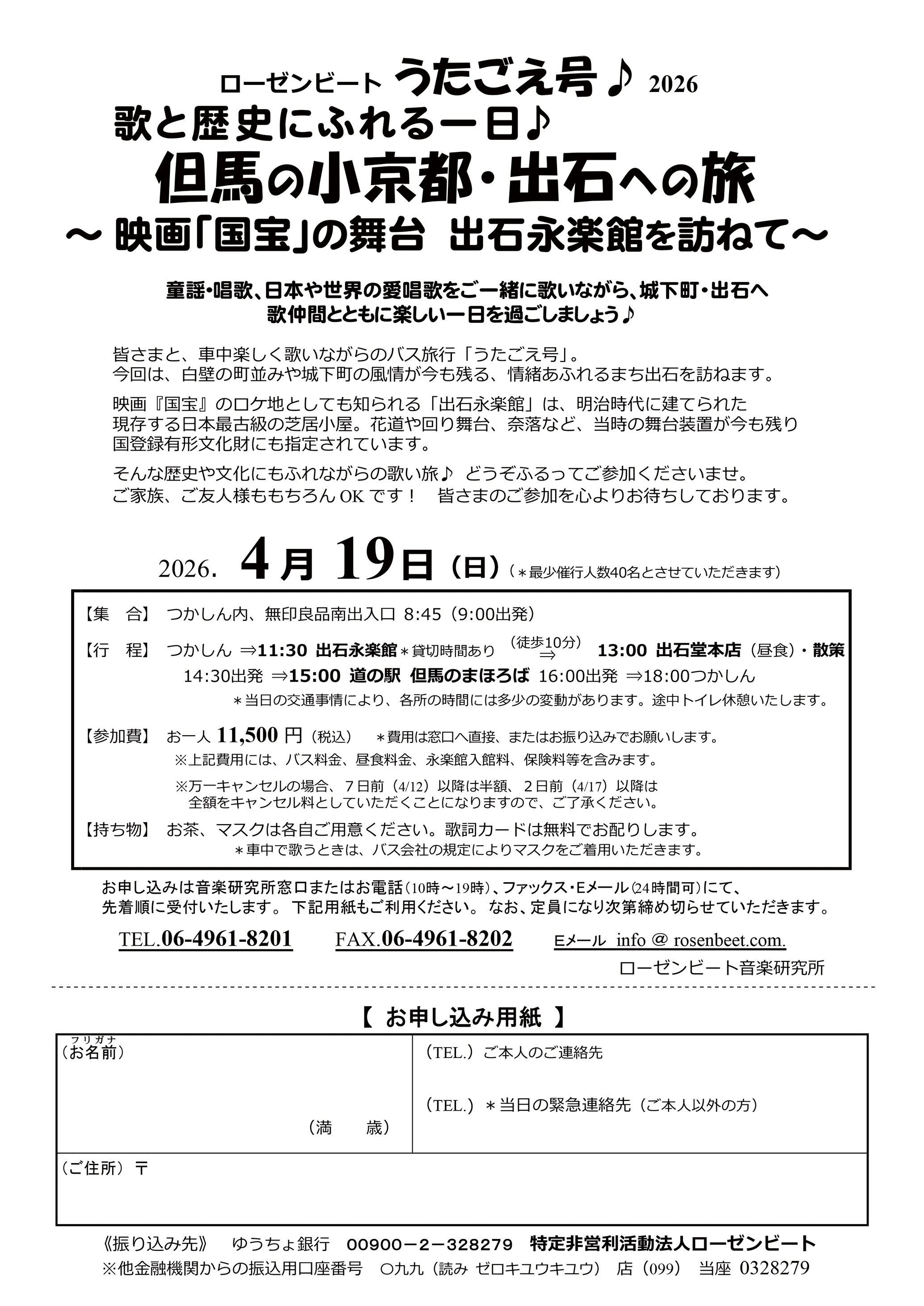 ローゼンビート うたごえ号♪2026は歌と歴史にふれる一日♪但馬の小京都・出石への旅~映画「国宝」の舞台 出石永楽館を訪ねて~童謡・唱歌、日本や世界の愛唱歌をご一緒に歌いながら、城下町・出石へ歌仲間とともに楽しい一日を過ごしましょう♪