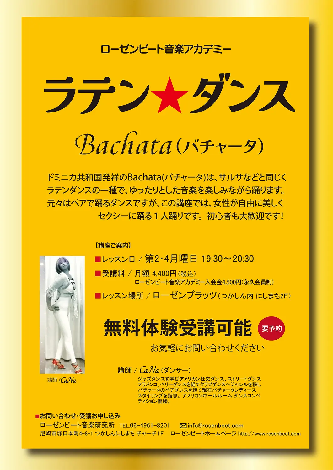 ドミニカ共和国発祥のBachata(バチャータ)は、サルサなどと同じくラテンダンスの一種で、ゆったりとした音楽を楽しみながら踊ります。元々はペアで踊るダンスですが、この講座では、女性が自...