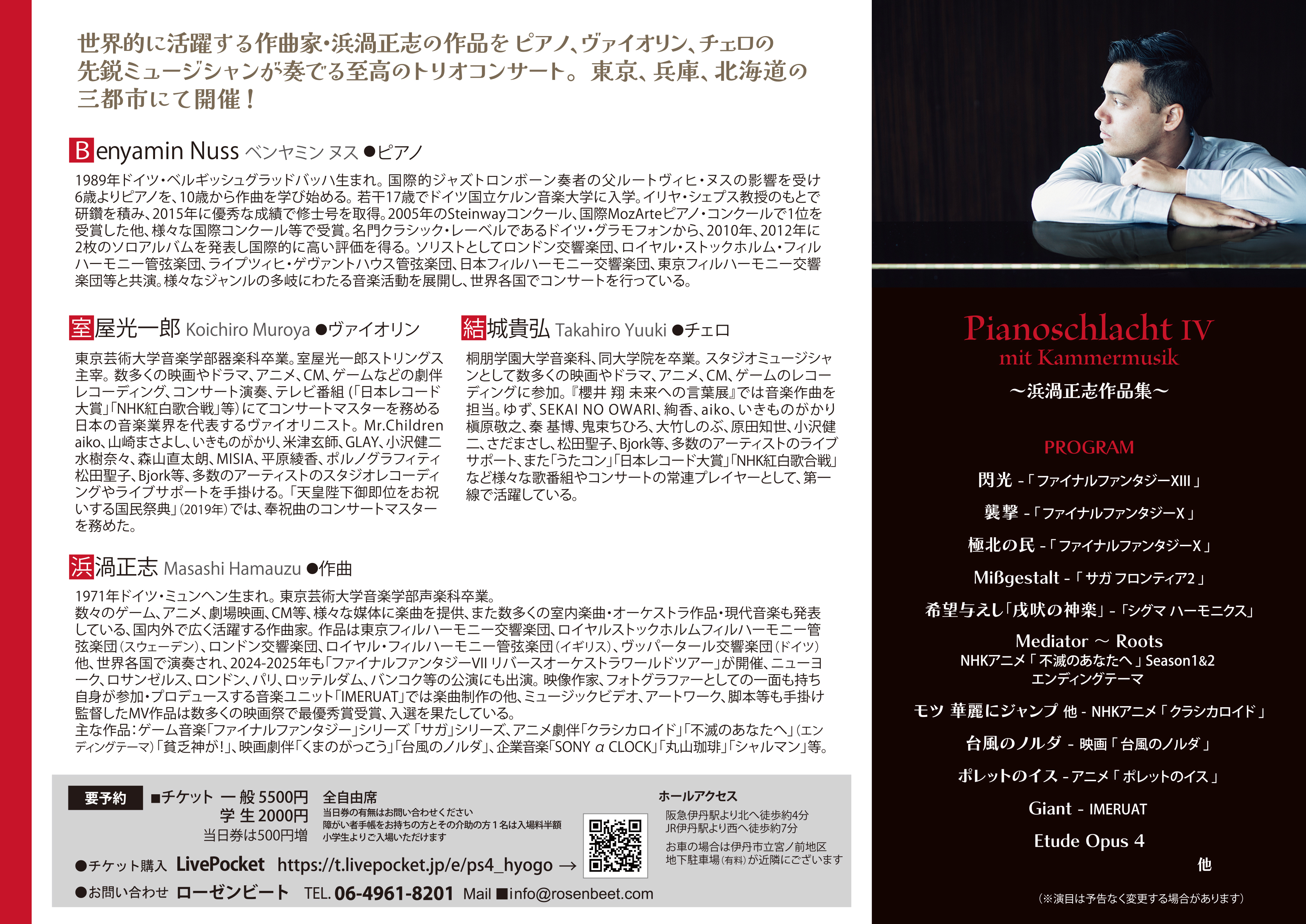 世界的に活躍するピアニスト、ベンヤミン・ヌスをドイツより招聘し、さらに日本を代表する二人のスーパープレイヤー、ヴァイオリニスト室屋光一郎、チェリスト結城貴弘を迎える”奇跡の豪華布陣”が実現!