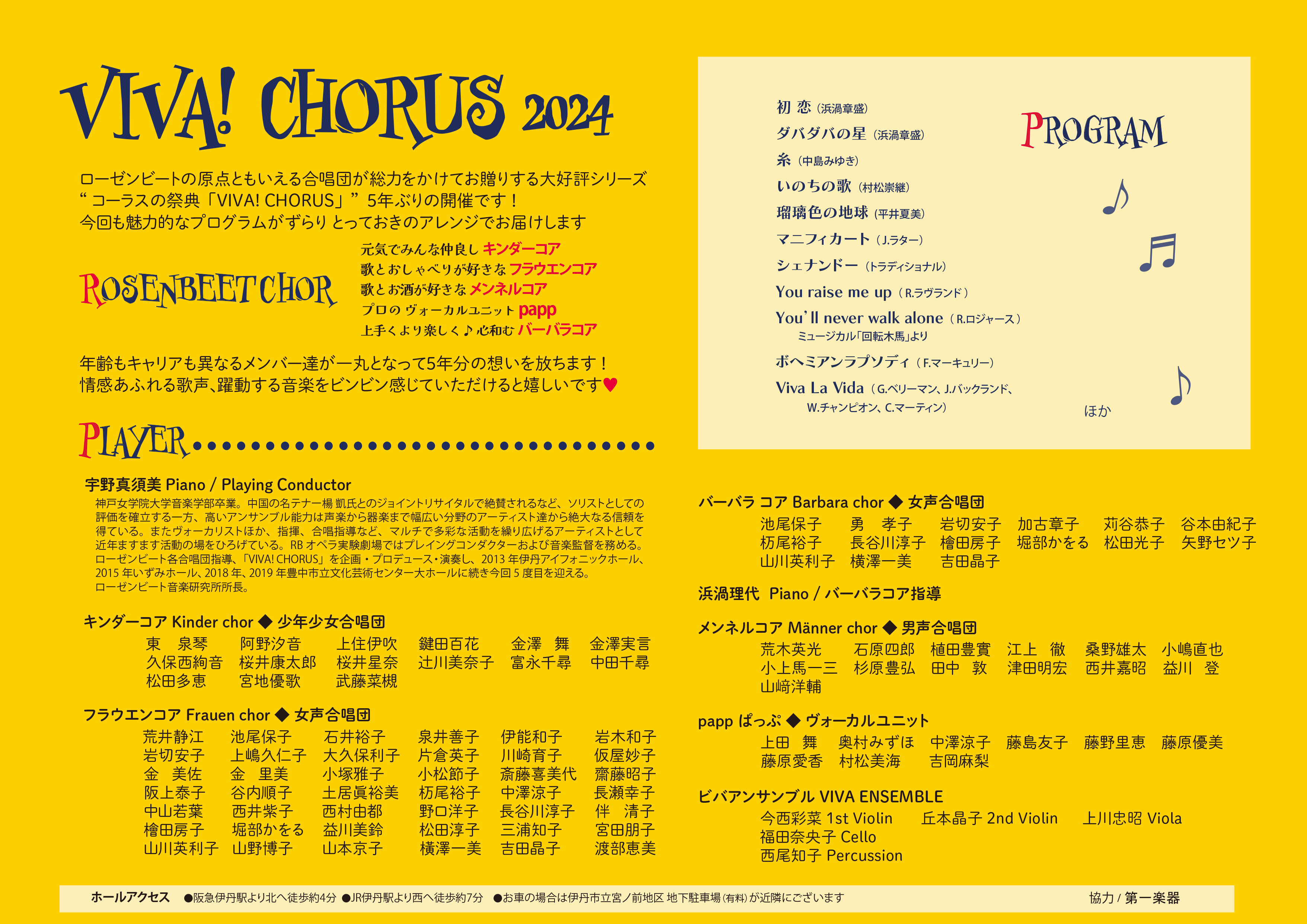 今回も、映画音楽あり、ラテンあり、ジャズあり、黒人霊歌あり、当日のおたのしみコーナー!?ありと、最強サポートアーティスト集団 ビバアンサンブルと共にますますパワーアップしたこの“コーラスの祭典”。