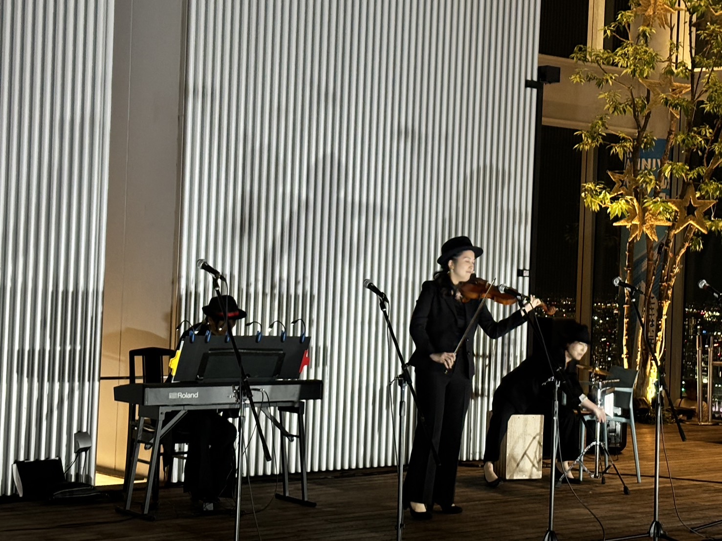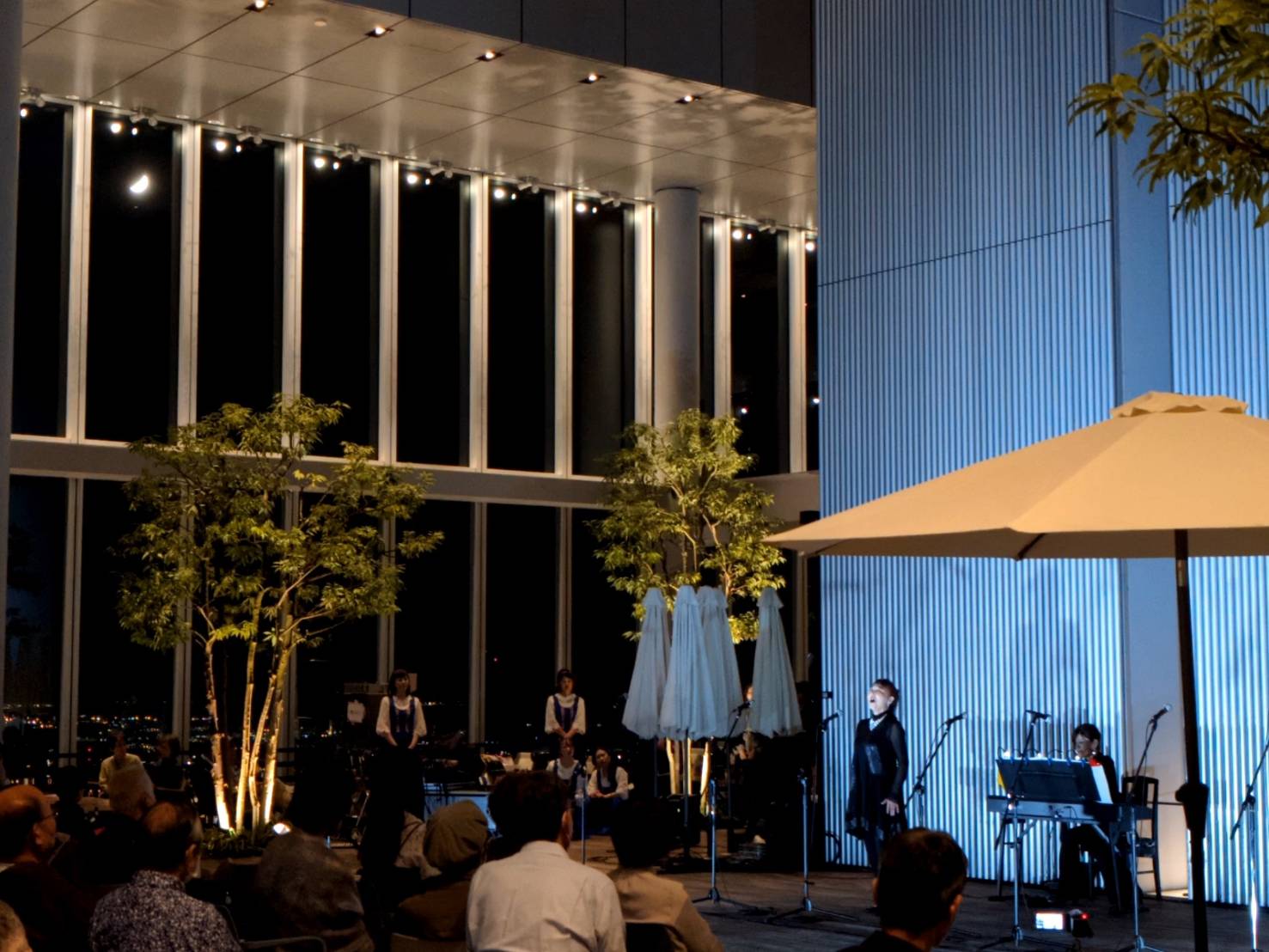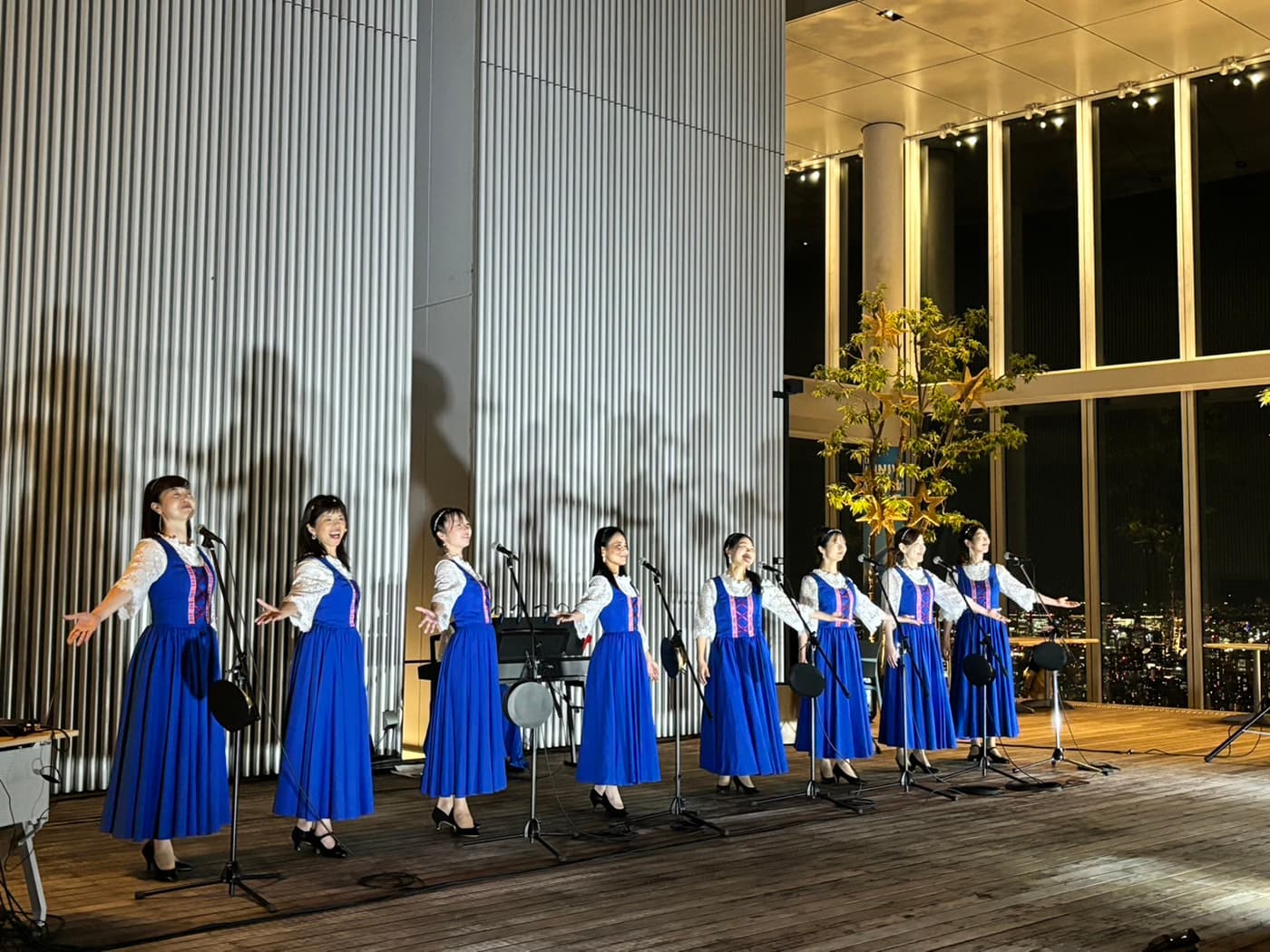 『VIVA! CHORUS』を終えたばかりの合唱団員および出演者のみなさま、音楽アカデミー受講生と講師のみなさま、いつも応援してくださるコンサート会員Asのみなさま、そしてそれぞれのご家族をご招待し、約300名が天空に集いました。息をのむような360度の美しい夜景、夜空と繋がるステージでの演奏…仲間やご家族との特別な夜を過ごされたみなさんから、「至福の時間でした」「夢のようなひととき」「何という贅沢な時間!」「音楽が空に響いていくようで幻想的でした」などなど喜びのお声をたくさんいただきましたもちろん演奏家も地上300mでの“初”ステージを存分に楽しみました♪そんな、みなさまの思い出に残る一夜をデザイン出来たことこそが、私たちスタッフの大きな喜びであり幸せです♡