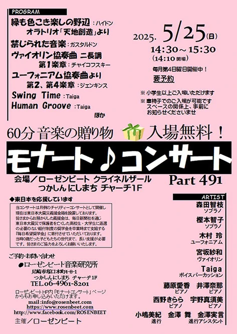 - 2025年5月25日(日) 14:30~ 終了しました モナートコンサート 〈60分音楽の贈り物〉 Part 491