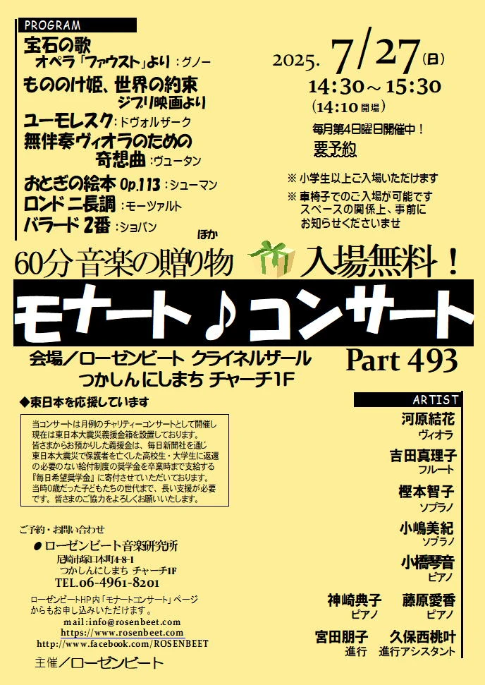 - 2025年7月27日(日) 14:30~ 終了しました モナートコンサート 〈60分音楽の贈り物〉 Part 493