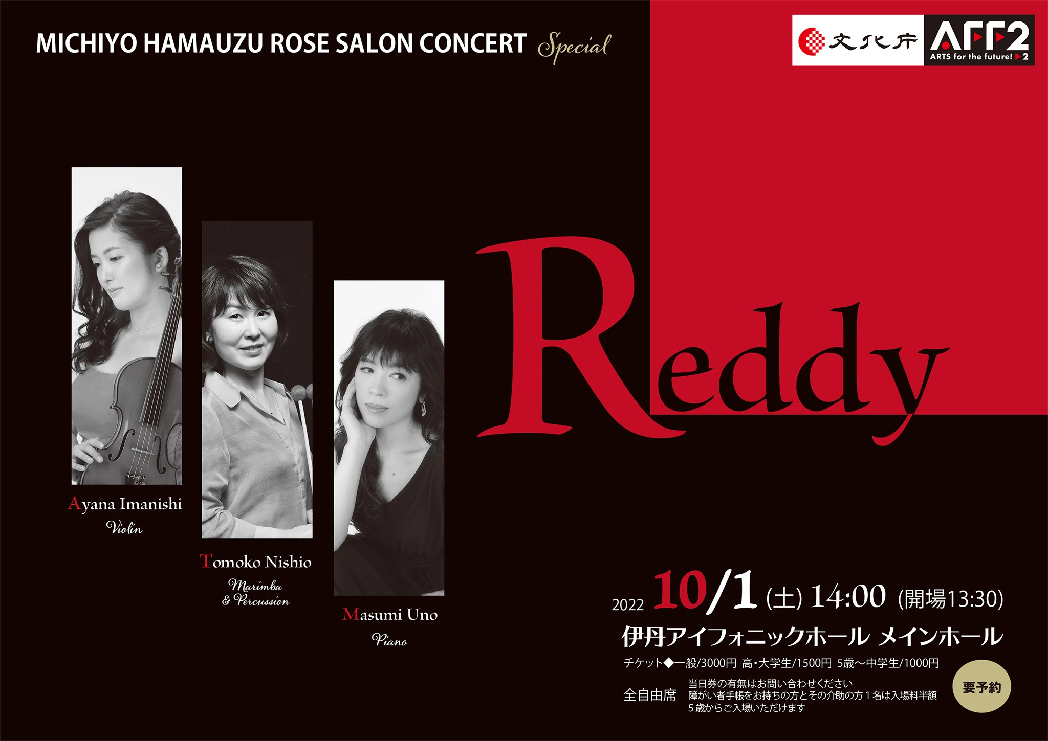 - 2022年10月1日(土) 14:00~ 終了しました 浜渦理代 ローズサロンコンサート 浜渦理代ローズサロンコンサート Part 354 Special 「Reddy」 文化庁AFF2公演