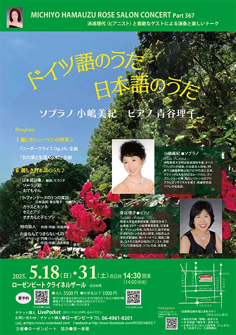 - 2025年5月18日(日) 14:30~ 終了しました 浜渦理代 ローズサロンコンサート 浜渦理代ローズサロンコンサート Part367 「ドイツ語のうた 日本語のうた」